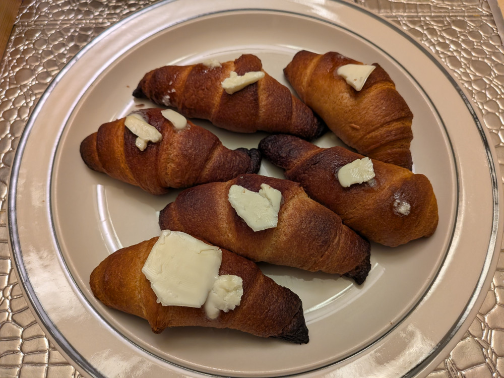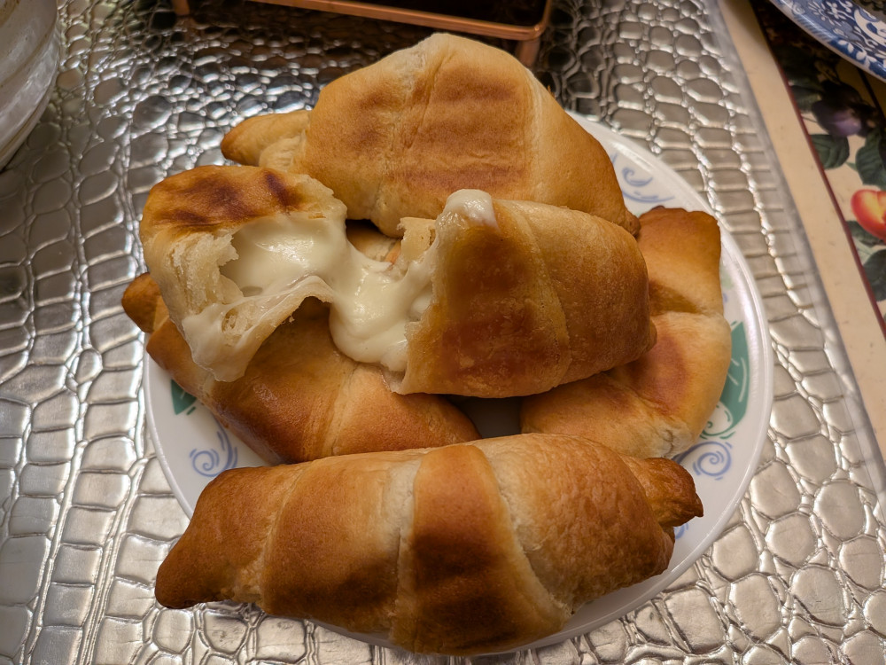 我老公把Pillsbury 的速冻croissant皮,顺便也卷起来烤了。