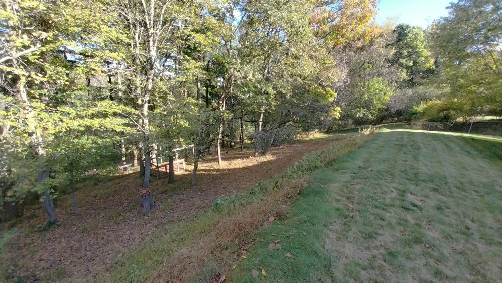后面半个公顷左右是野草地,比较低些。每年割2-3次草就行了。上周割了,现在掉了点树叶在地面,也蛮好看的,照片里就是。那铁丝网篱笆就围着这0.5公顷+0.5公顷面积, 挡不住猫,也挡不住鹿。