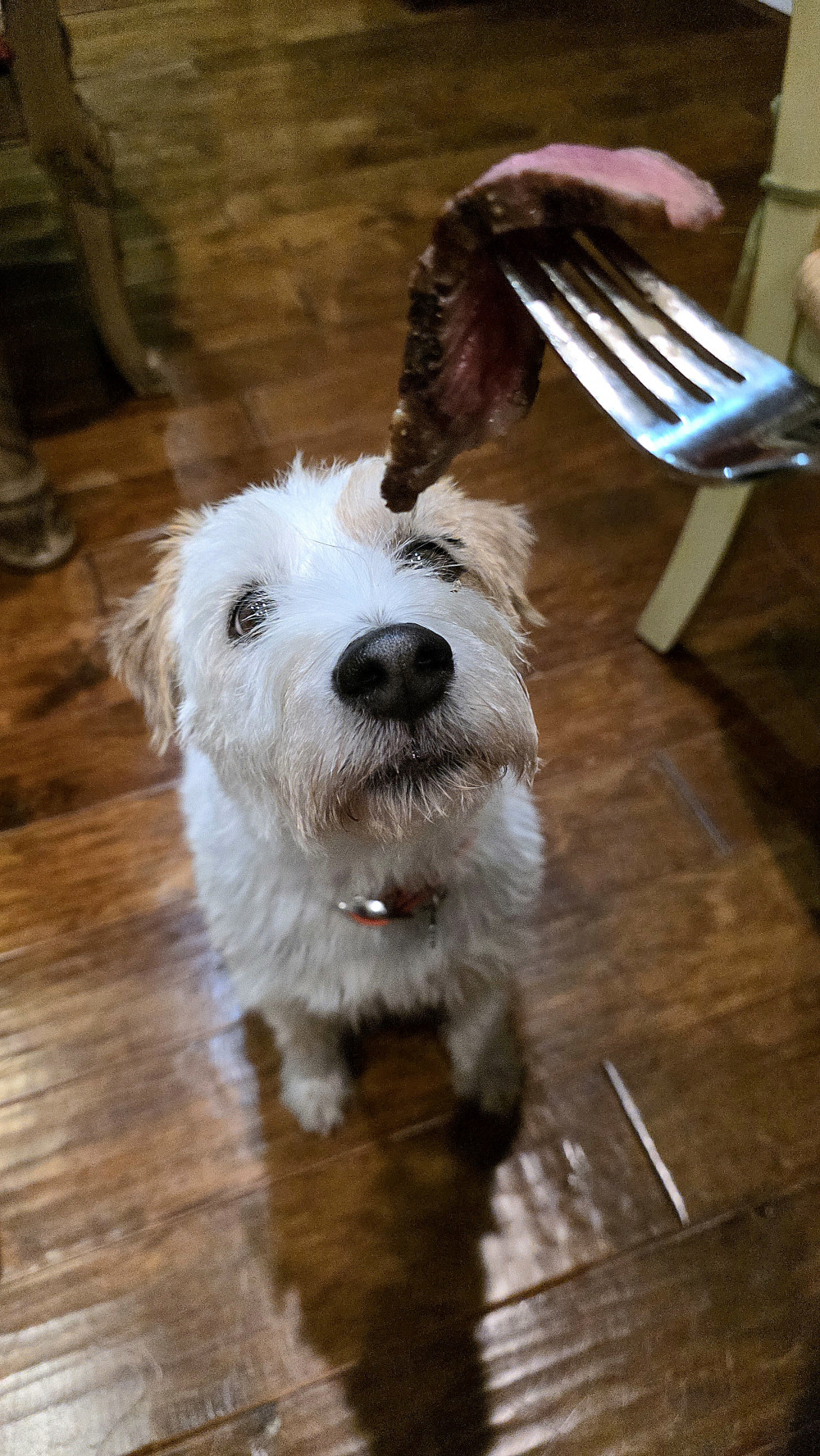 我家的狗儿子肉永远吃不够。 他自己的晚饭吃完之后又吃了三四个这么大的牛眼肉。