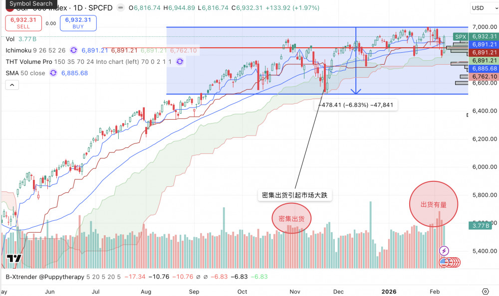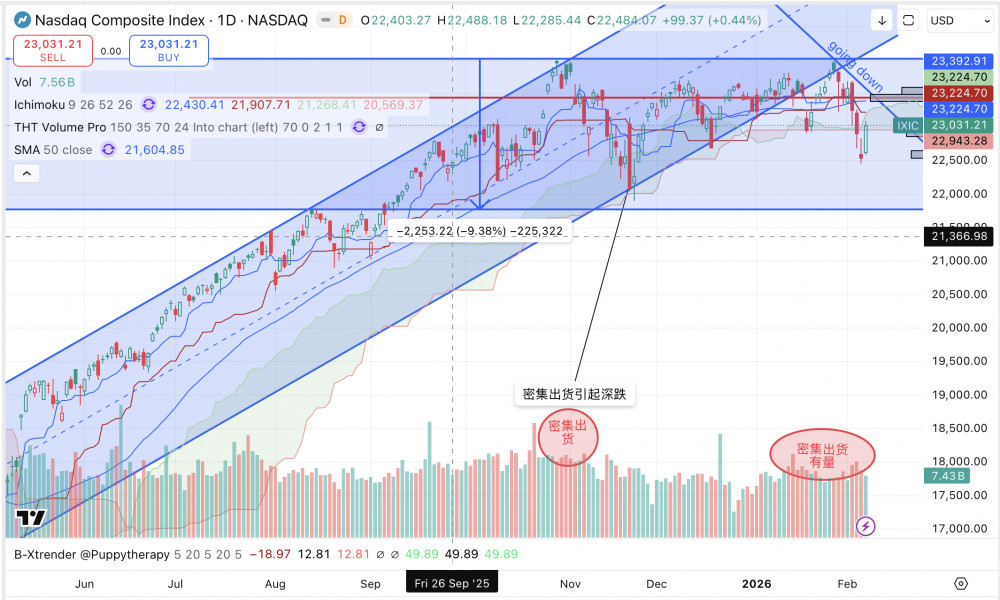 主要是量价还不行。下行有量,反弹无量。纳指和SPY的表现还是出货。连续密集的出货后面往往不看好,比如下面两个图的去年Nov连续密集出货后就出来一个比较深的跌。