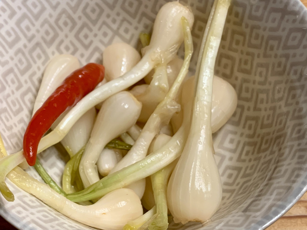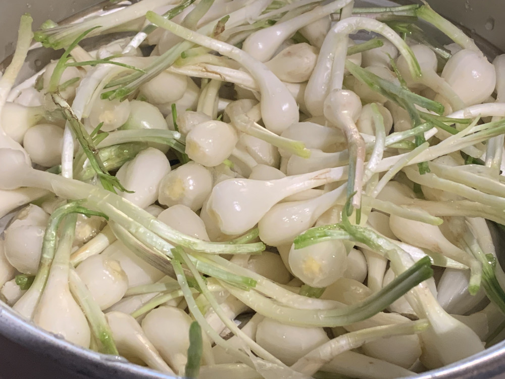 藠头是一种特别的葱,又叫它拖尾巴葱。拖尾巴葱这个名字很形象地形容了它的形态。实际上没有人怎么吃地上那部分绿色的葱,都是春天的时候用葱头做泡菜或者腌咸菜。时间很短,刚刚出笼的洗水泡菜藠头非常好吃。但是因为其本身是葱类,很多人并不喜欢让泡菜坛子的水都变成这个葱的味道,家里会用一个小小的坛子专门给藠头做泡菜。