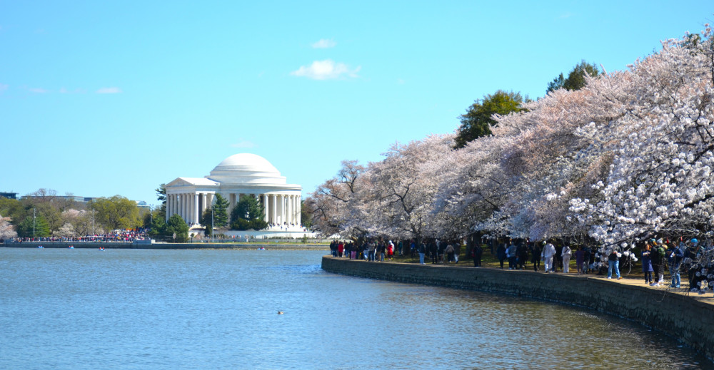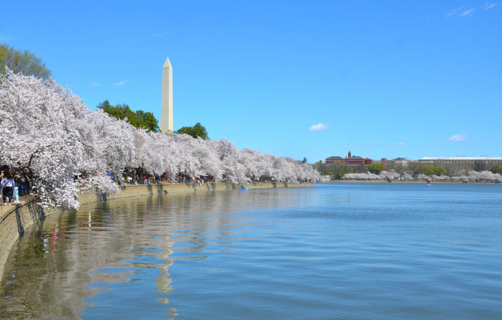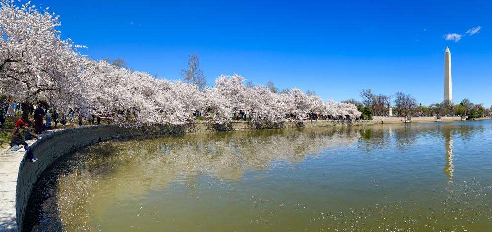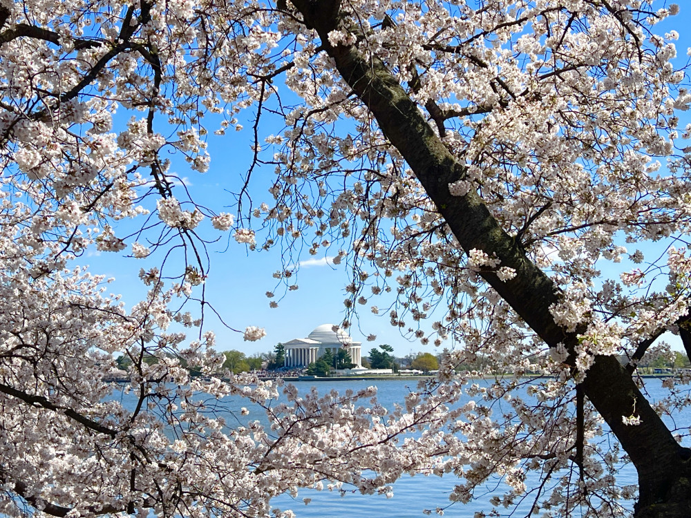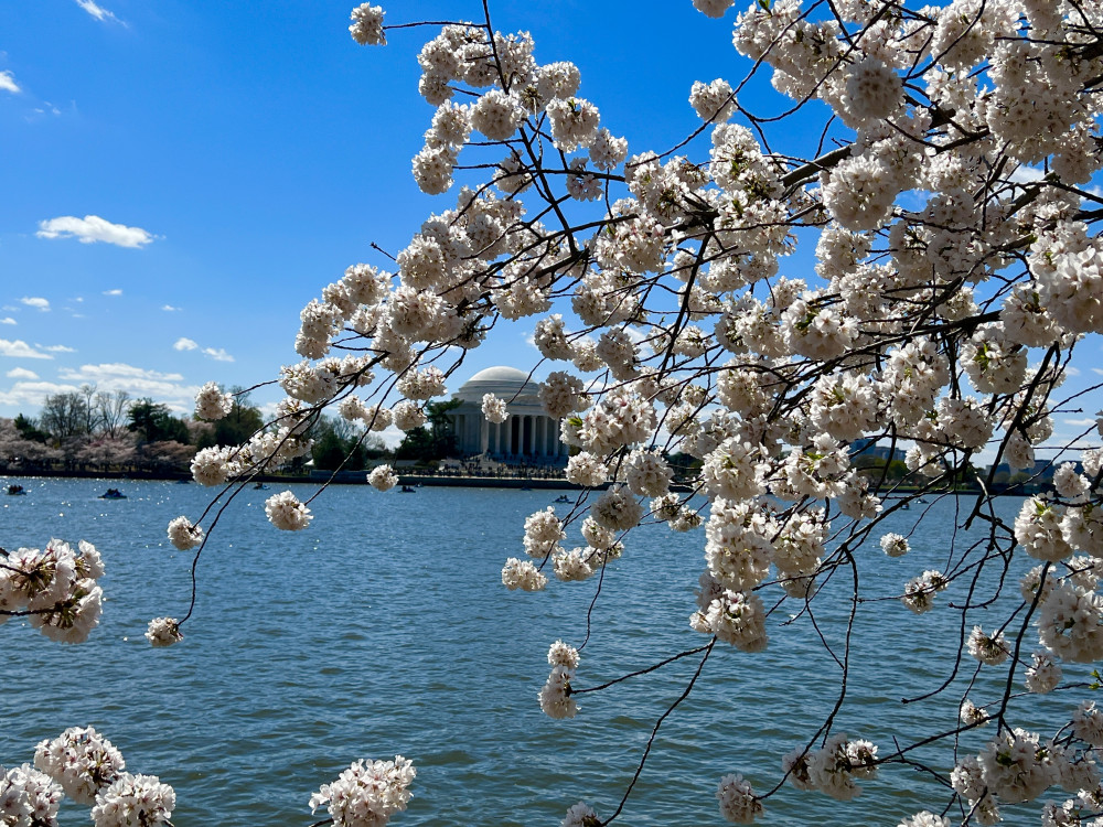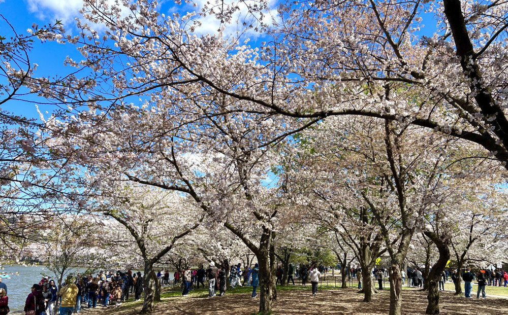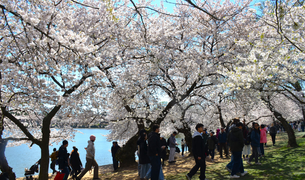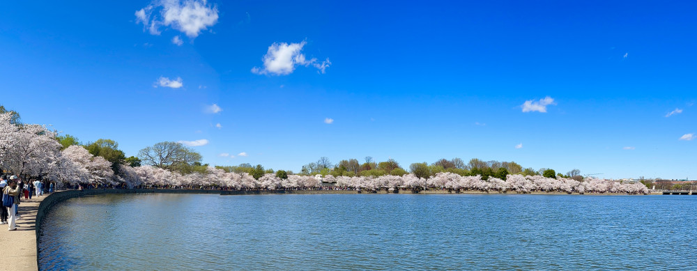 春天让人惊艳的花都有一个共同点:就是花期都很短暂,所谓韶华易逝,樱花就是一个典型的例子。DC的潮汐湖畔是世界著名的赏樱之地,也可以算DC的重要地标。得天独厚的地理条件,配上环湖一圈绽放的樱花,稍有想象力的都不难想像花季高峰的盛景。樱花是日本大和民族的象征,而潮汐湖畔的樱花则是一百多年前的日美亲善的结果,都是当时的日本政府所赠送的。虽然后来两国兵戎相见,甚至日本成为世界上唯一一个尝到美国原子弹核爆威力的国家,但日美亲善的樱花倒没有被殃及池鱼, 每年依然绽放湖畔。今年为了庆祝美国建国250周年,日本首相高市前不久访美还专门送上250株樱花树作为贺礼。当然,今年开放的樱花肯定没有高市首相赠送的樱花了,只能以后才有机会观赏了。