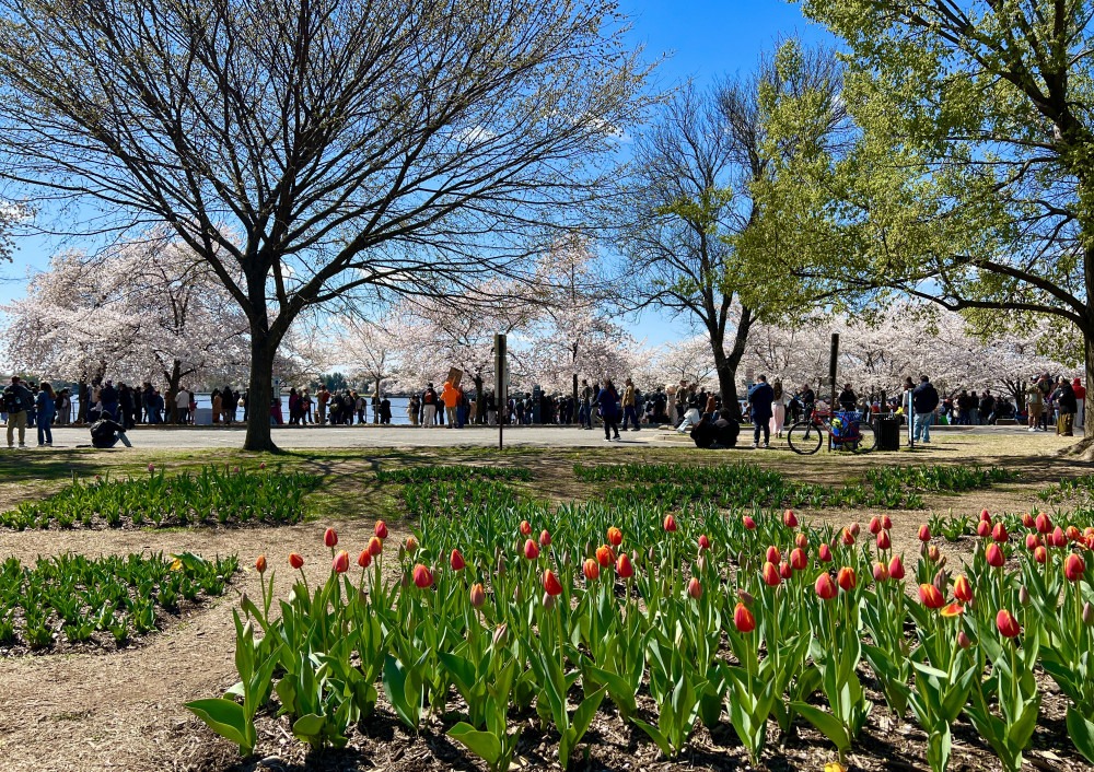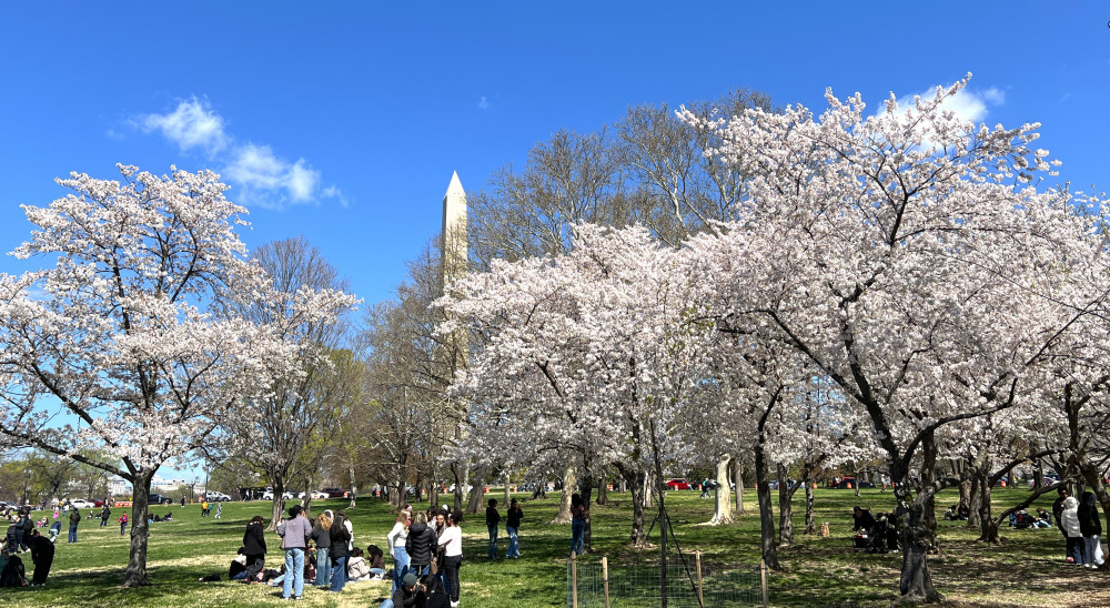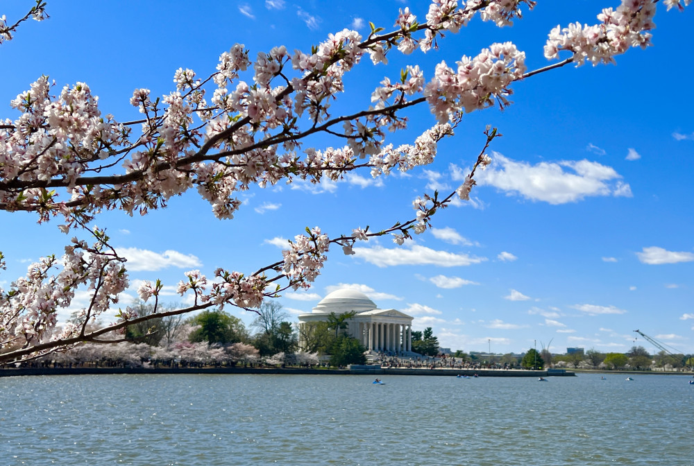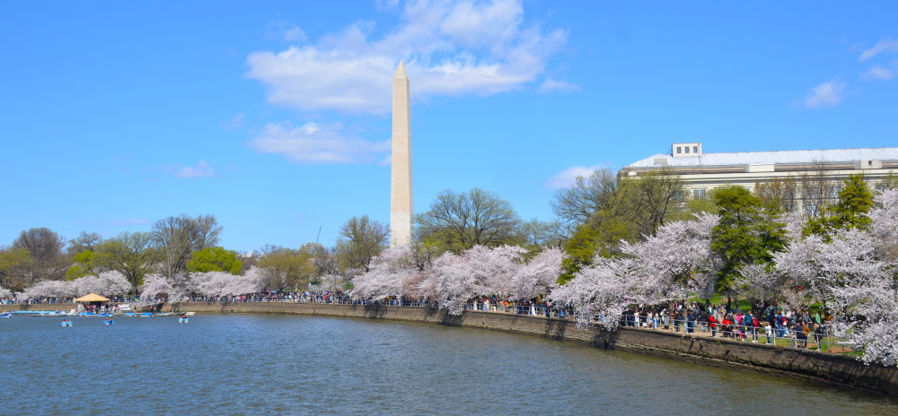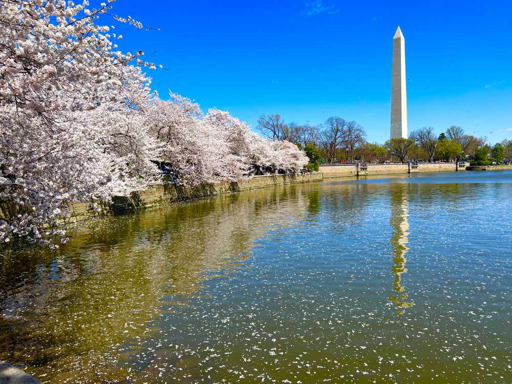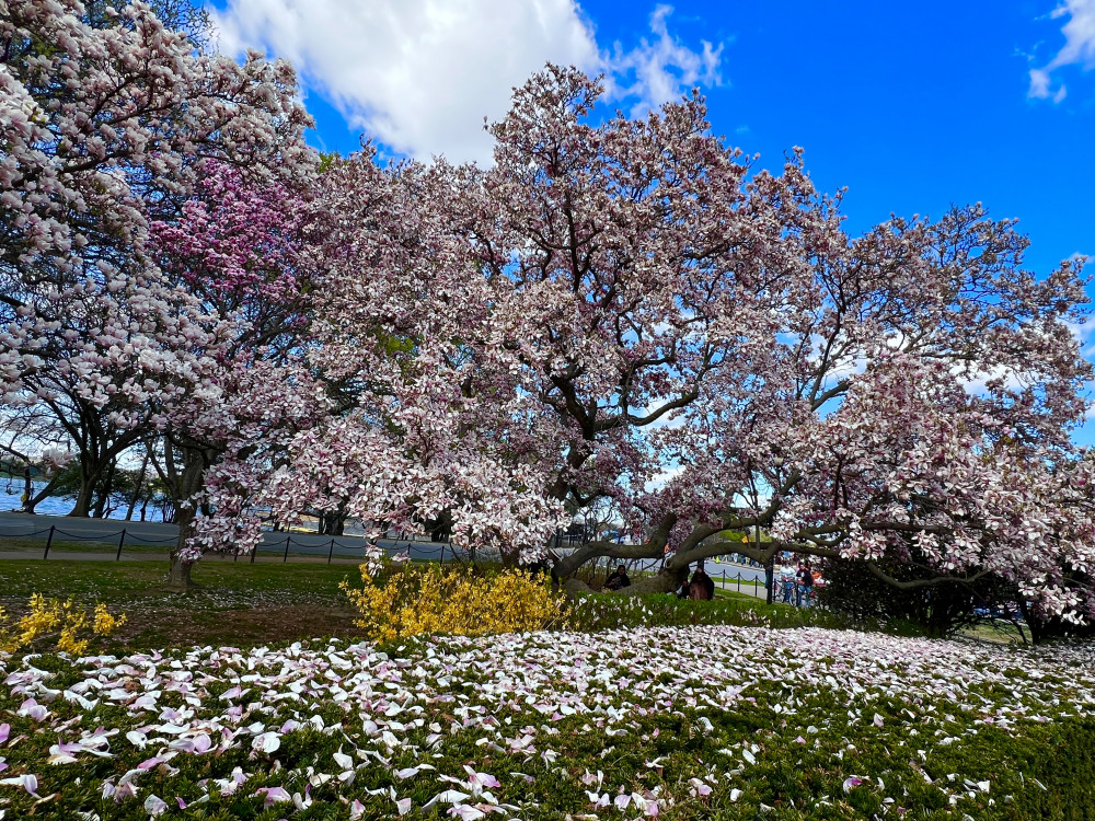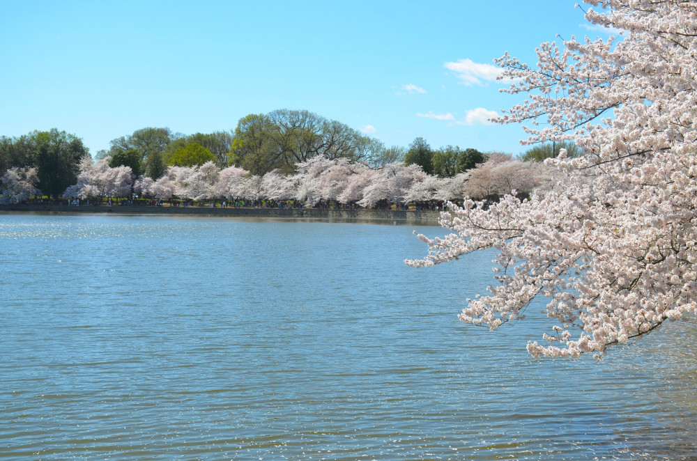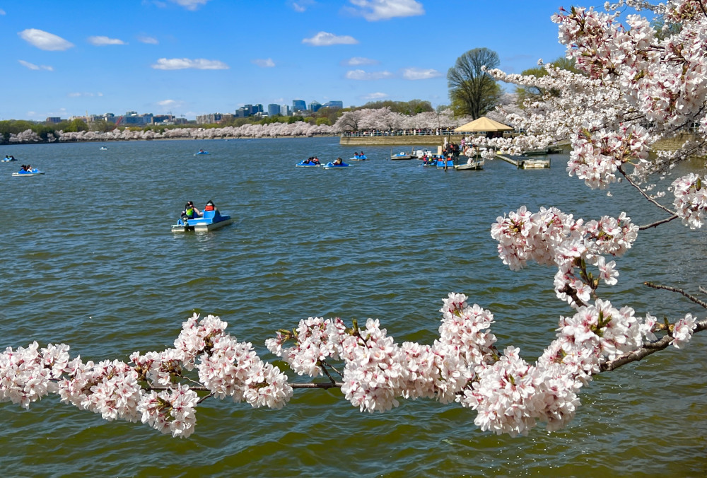 春天让人惊艳的花都有一个共同点:就是花期都很短暂,所谓韶华易逝,樱花就是一个典型的例子。DC的潮汐湖畔是世界著名的赏樱之地,也可以算DC的重要地标。得天独厚的地理条件,配上环湖一圈绽放的樱花,稍有想象力的都不难想像花季高峰的盛景。樱花是日本大和民族的象征,而潮汐湖畔的樱花则是一百多年前的日美亲善的结果,都是当时的日本政府所赠送的。虽然后来两国兵戎相见,甚至日本成为世界上唯一一个尝到美国原子弹核爆威力的国家,但日美亲善的樱花倒没有被殃及池鱼, 每年依然绽放湖畔。今年为了庆祝美国建国250周年,日本首相高市前不久访美还专门送上250株樱花树作为贺礼。当然,今年开放的樱花肯定没有高市首相赠送的樱花了,只能以后才有机会观赏了。