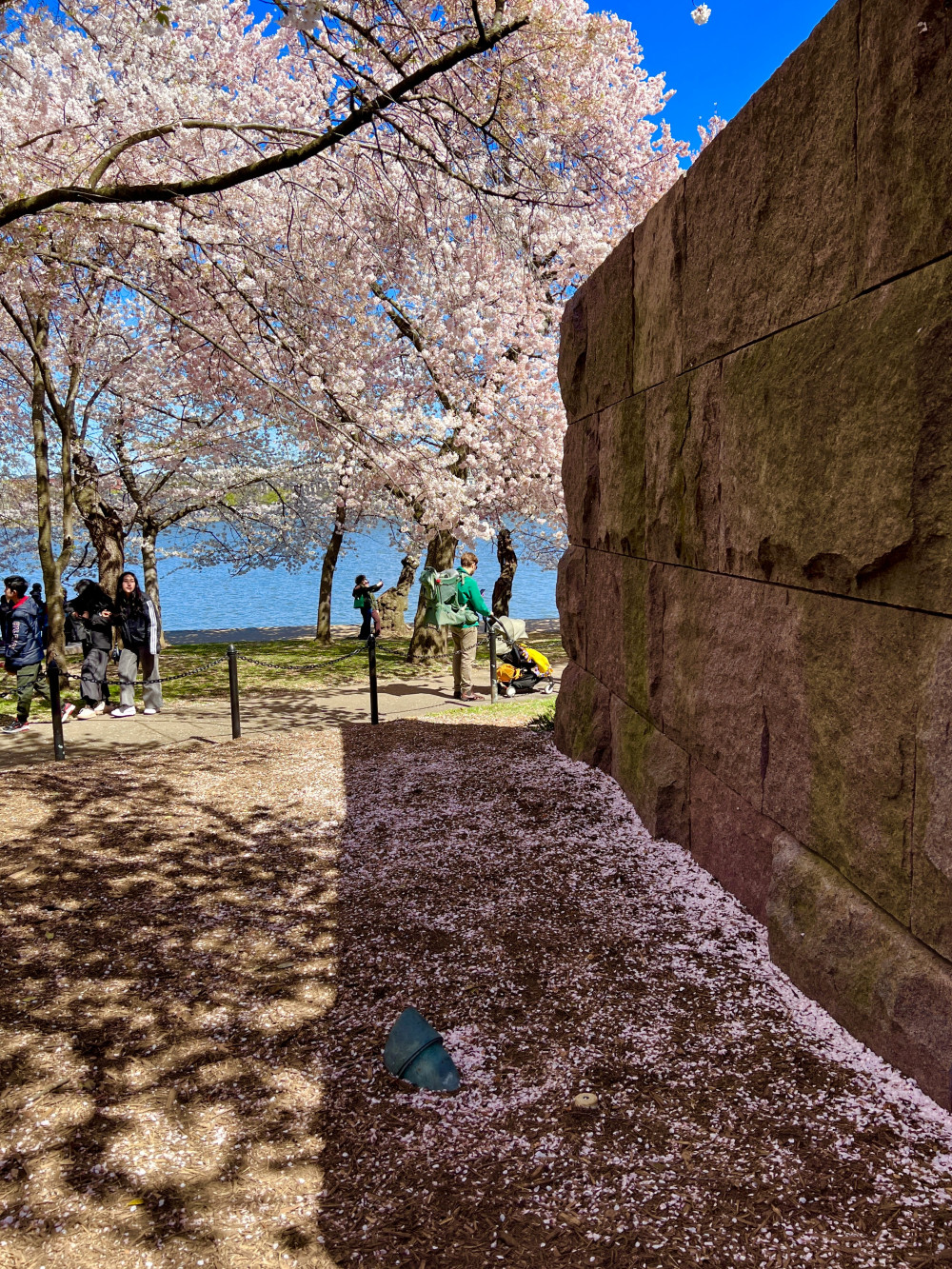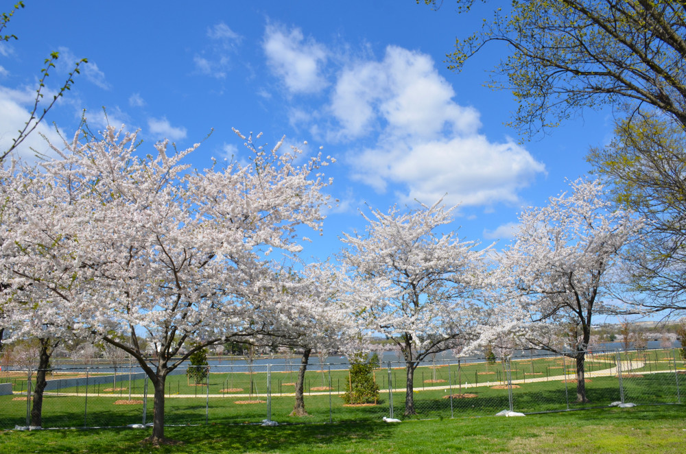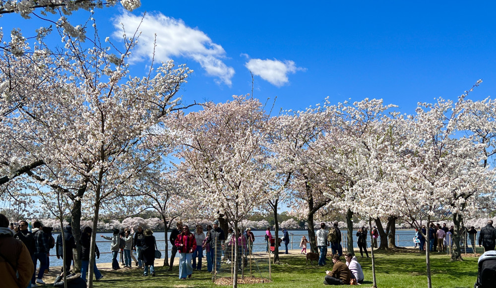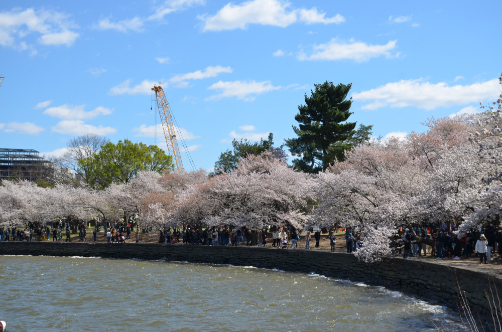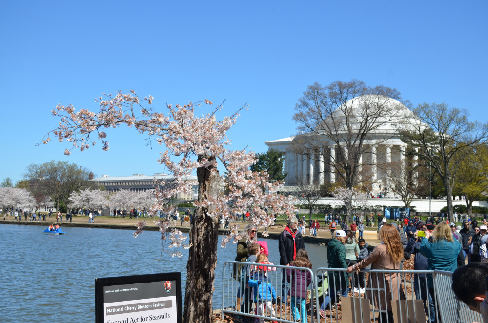 因为湖畔有些地段下陷,尤其是Thomas Jefferson Memorial附近。我过去十多年亲眼看见这些地段下陷日趋严重,后来湖水都漫到路上了让行人无法行走了。2024年樱花开完之后,这些地段就完全封闭起来整修了,预计工程三年完成。去年樱花高峰绕湖一圈的时候,这些地方正在施工,里面的樱花树都被砍了。其中有一颗老树2024年成为网红树,无数人围着拍照,甚至连美国的所谓主流媒体都有报道,而前些年这颗老树可以说是默默无闻,虽然它一直在那里。当然网红也避免不了被砍掉的命运,不过至少算临死之前过了一把瘾。今年再度光临,看见施工地段已经基本上完工了,地平面升高了不少,新树也大多种上了,可见过去一年国家公园管理局确实干了不少事。但可能还需要种一些树吧,我看见还有树苗在旁边,至少高市首相赠送的250株贺礼必须种在潮汐湖畔,不过看起来三年的工程可以提前完工了。