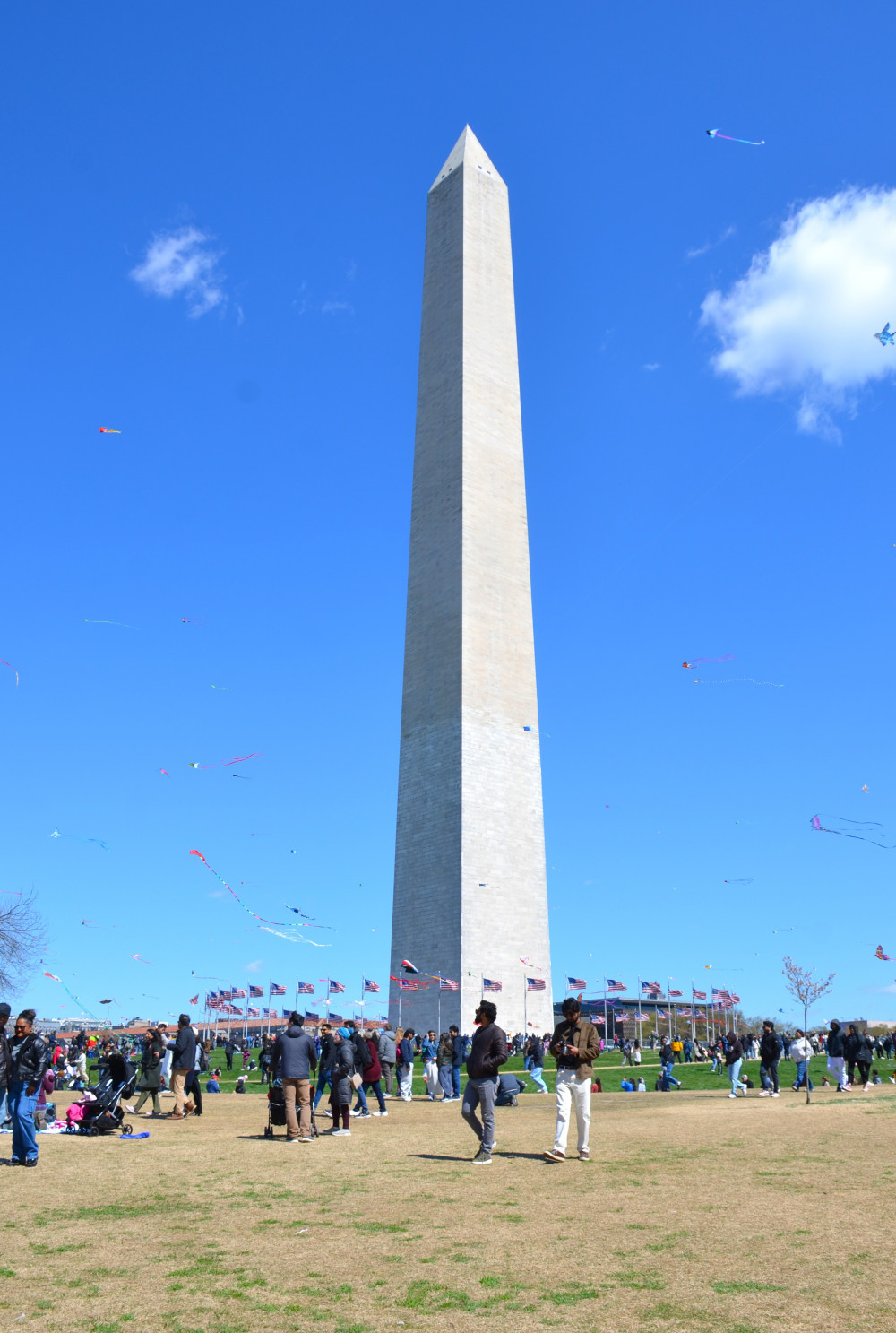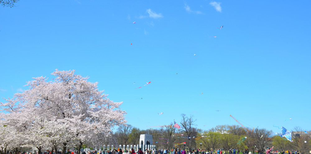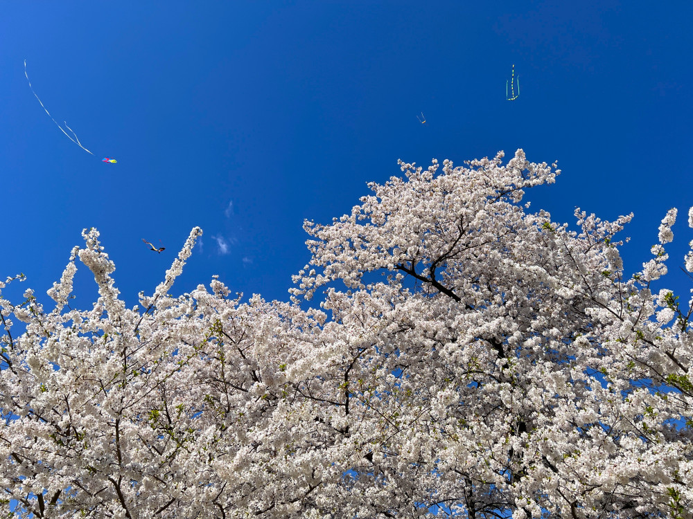 每年的樱花期间有风筝节,就在Washington Monument下面。多年前我也曾带儿子去放过风筝,不过,飞了半天风筝也飞不高,所以后来就再也没有去过了。因为樱花花期难以准确预测,而风筝节的日期都是早就定好的。所以对于我们这些观赏樱花的爱好者来说,实际上花期正好与风筝节重合的机会并不多。不过今年走路正好看到天上飘浮着众多风筝,就顺便转到旁边一观,正是DC的风筝节。飞得高的风筝确实不多,大多数不到跟前根本看不见。不过,各种不同颜色,形状的风筝映照在蓝色天幕上,围绕DC最标志的建筑:Washington Monument,倒也是一景。