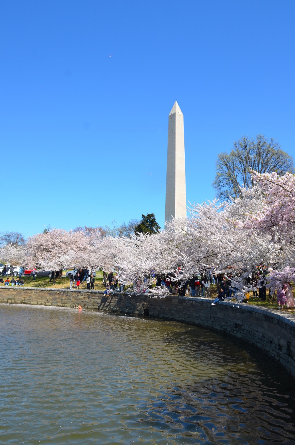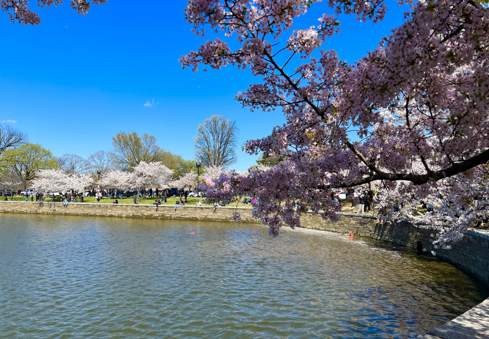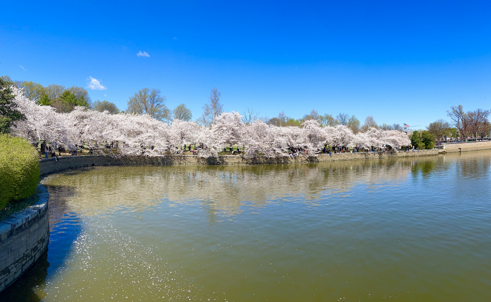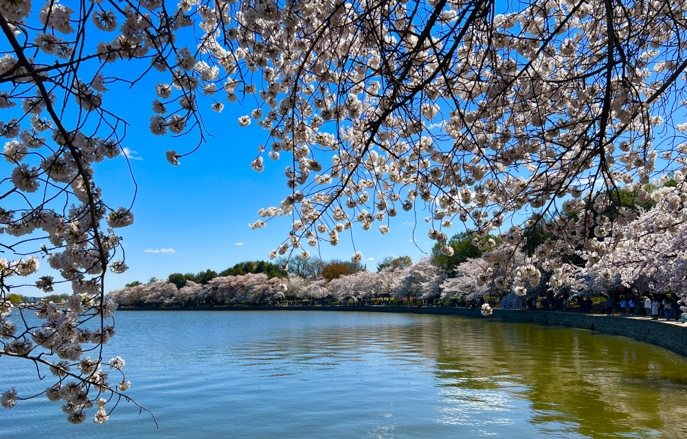 作为居住在附近的居民,有近水楼台之利,自然有更多机会观赏樱花。对于我来说,潮汐湖畔的樱花就像一位老友,到时自然就来相见,近10年唯一一次错过的樱花高峰就是因为2020年的疫情。前一个周末还去了潮汐湖畔看樱花,不过稍早了点。只有个别树开花,大多数樱花树都是含苞待放,当时想下个周末来正好。不料世事难料,因为疫情造成的全世界恐慌,美国政府突然宣布封城,当然没有大白堵住家门不让出门。我心想这不正好没什么人看樱花吗?就私自开车到了潮汐湖畔,不过到处都是警察不让停车,并且周围的停车场全部封闭不让停车。从车上看见只有极少数人在樱花树下闲逛,可以说是从DC一百多年前栽下樱花树以来潮汐湖畔最清净的一次樱花高峰期。我只能从车上稍微看了一眼潮汐湖畔盛开的樱花,无奈之下只能黯然离去。从此以后就更珍惜樱花时节了,每年都会去DC看樱花。
