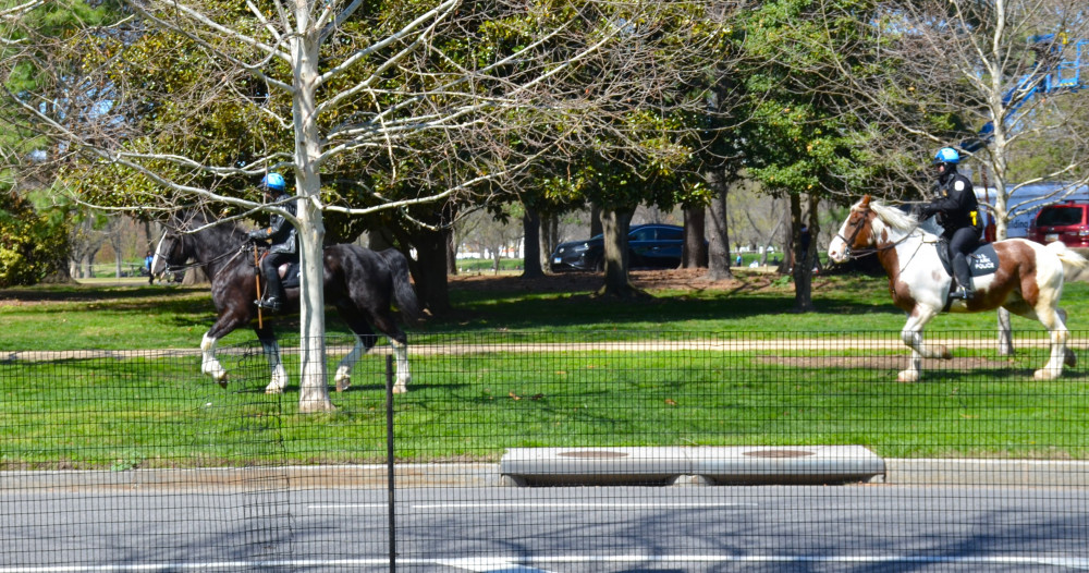 在小湖看见国家公园骑警从旁边马路边的人行道经过。