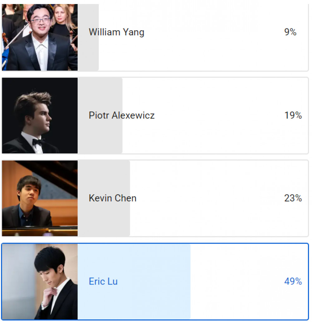 给出4人,3个华裔,大概是决赛选手。小 Lu 民调大幅领先,是获奖大热门