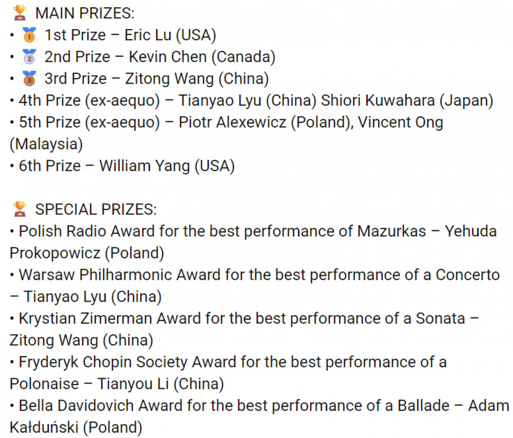 第19届肖邦国际钢琴比赛结果公布