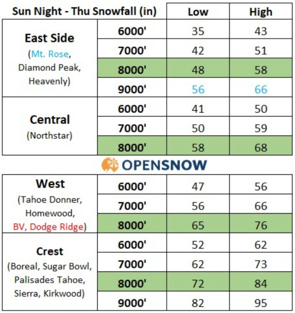 下周的雪况预报, 单位英寸。 再往后一个礼拜还要接着天天下!