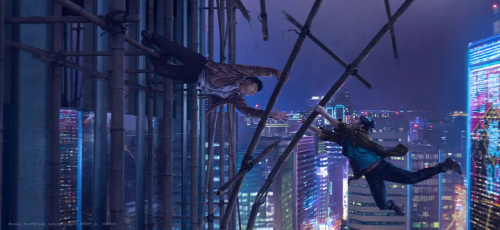 这种竹子脚手架上打斗的戏,在香港电影里还挺经典的。