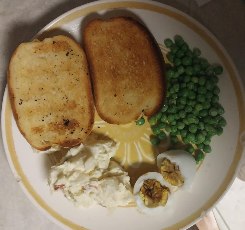 2片蒜香面包(烤一下),1只水煮蛋(加点酱油),1勺土豆沙拉(店里买的),1点青豆(微波炉里化冻热一下)