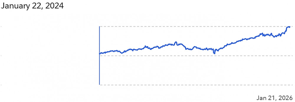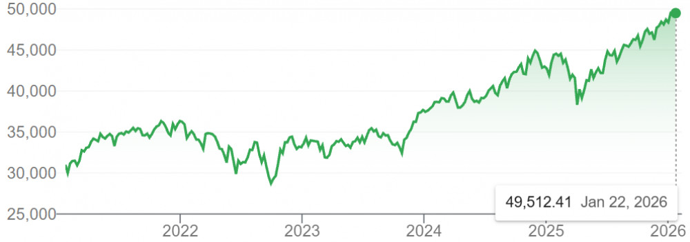 嗯?感觉二泉看错了。过去两年涨了大约28%。2024年1月初dow jones大约是38000。现在在49000上下。