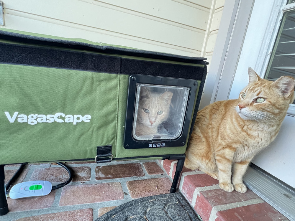 小儿送了圣诞礼物给猫兄弟,插上电可加热的猫屋。