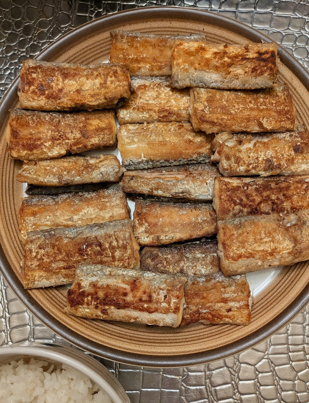 不过小时候吃过的带鱼更粗,有三根手指并起来那么粗。这个带鱼细很多,只有两根手指宽。